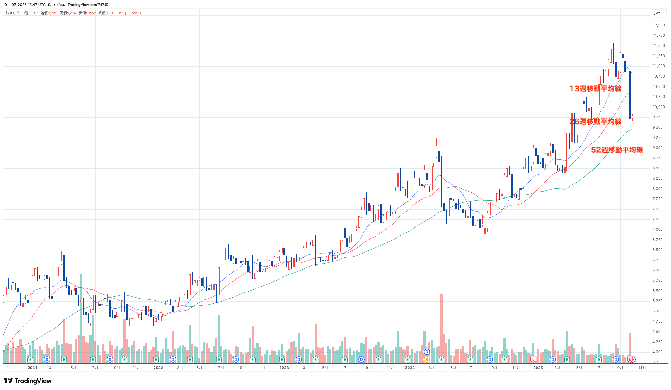 現在のしまむらの週足株価チャートを見ると、一番上の13週移動平均線がやや折れていますが、26週・52週移動平均線は上向きで、株価は52週移動平均線より上にあります。上昇トレンドが崩れたとはいえない状態です。反転してきたら、買いのタイミングと判断してもよさそうです。