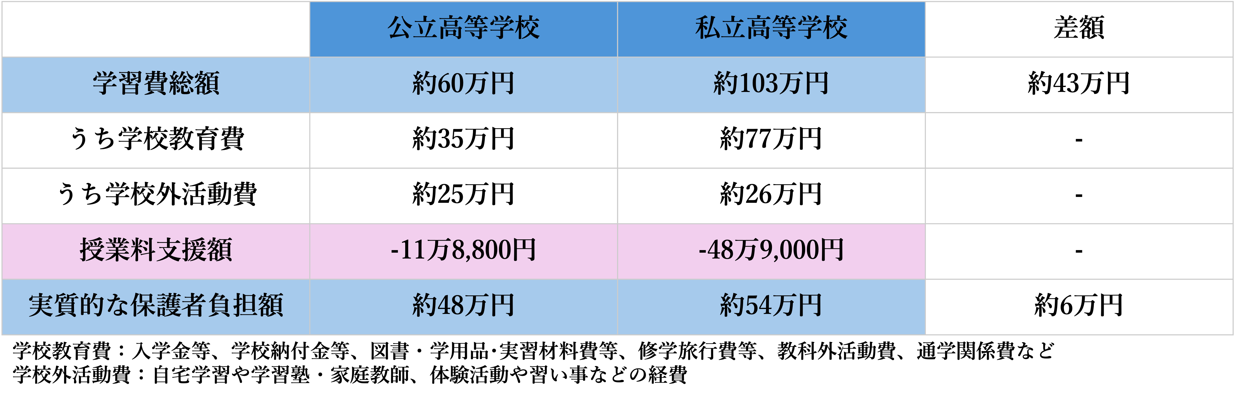 注意したいのは、支援の対象はあくまで「授業料」であるという点です。高等学校等にかかる費用としては、他にも教材費や部活動費、修学旅行費、さらに塾や習い事などの「学校外活動費」もかかります。