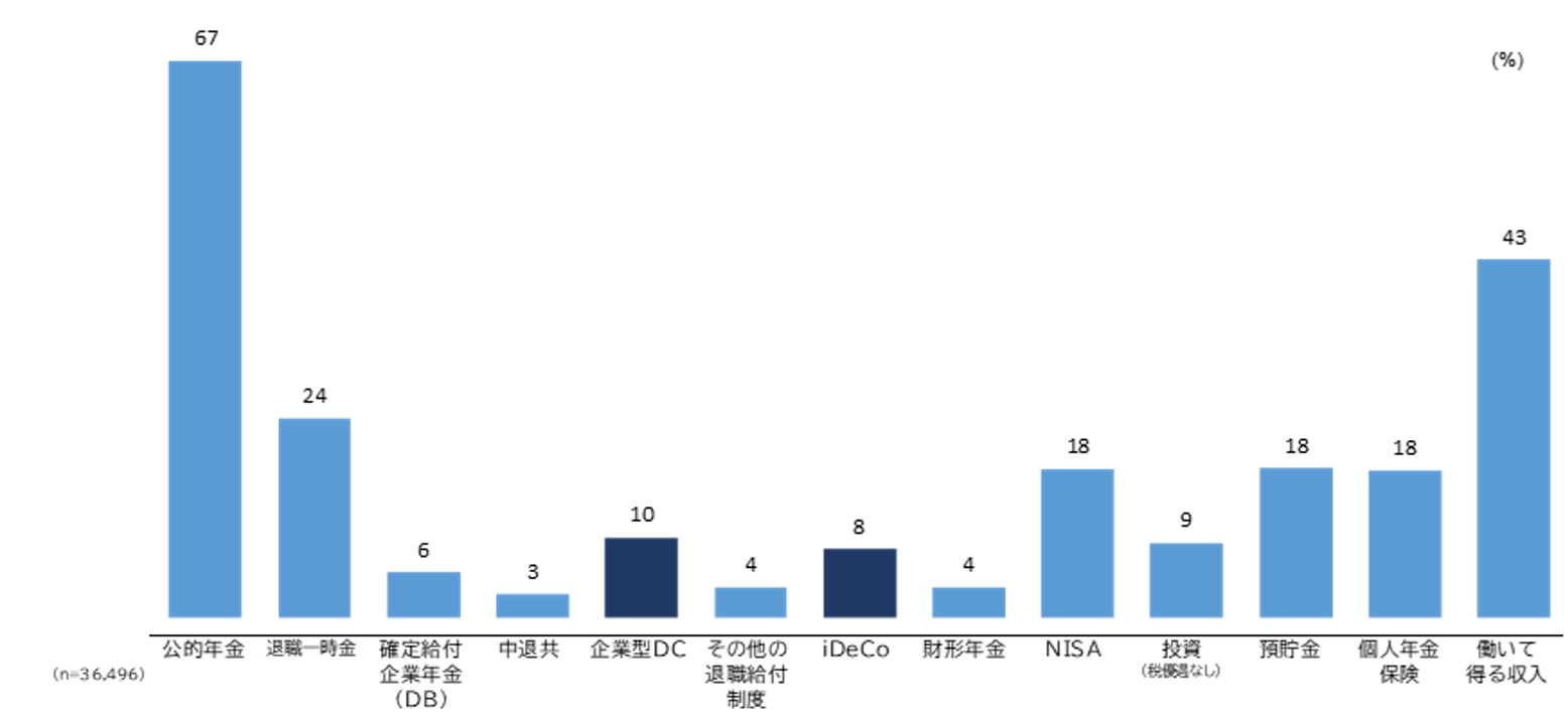 「公的年金」に続いて、2位は「勤労収入」(43%)でした。さらに「退職一時金」「NISA」「預貯金」「個人年金保険」が続きます。「確定拠出年金(DC)」は老後資金に特化した制度であるにもかかわらず、企業型・個人型(iDeCo)ともに、これらに劣後する結果となりました。