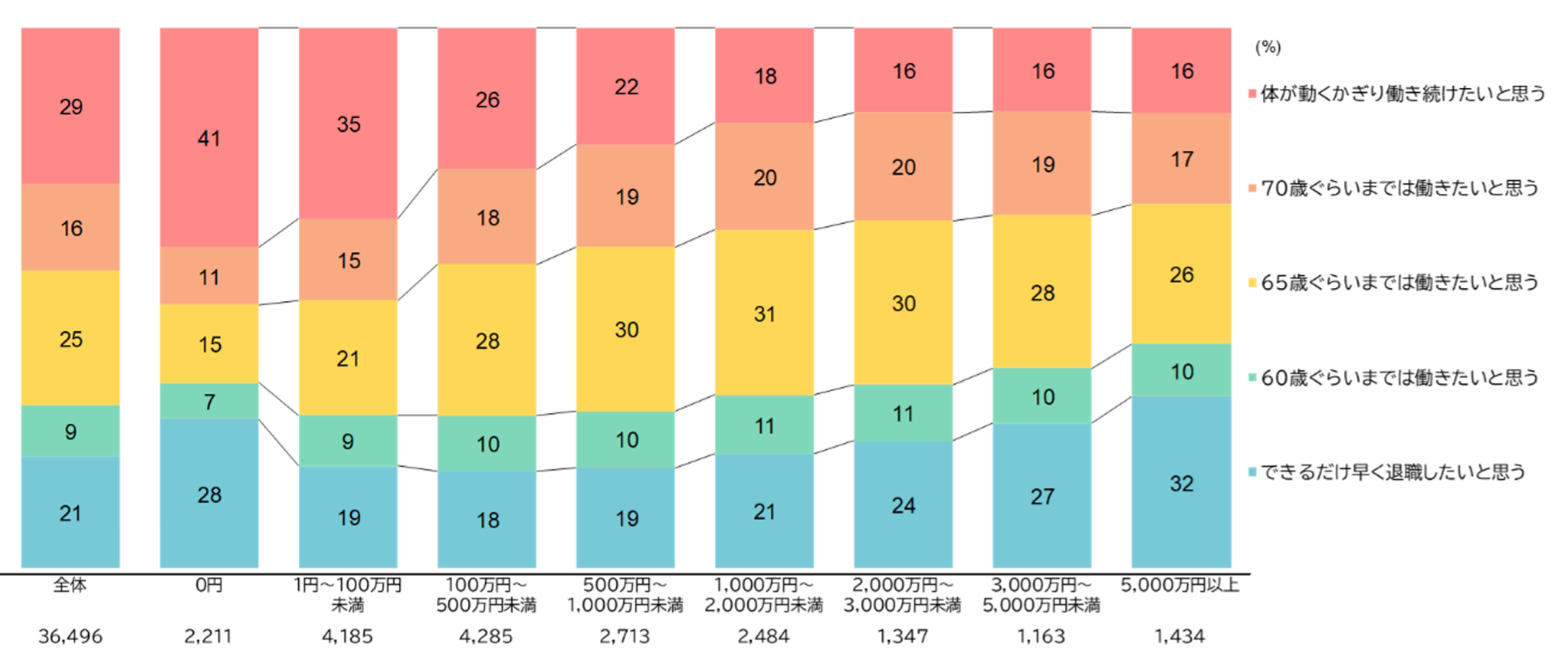 次に、何歳まで働きたいかについて質問をしてみました。その結果を保有金融資産別に比べたのが図表2です。