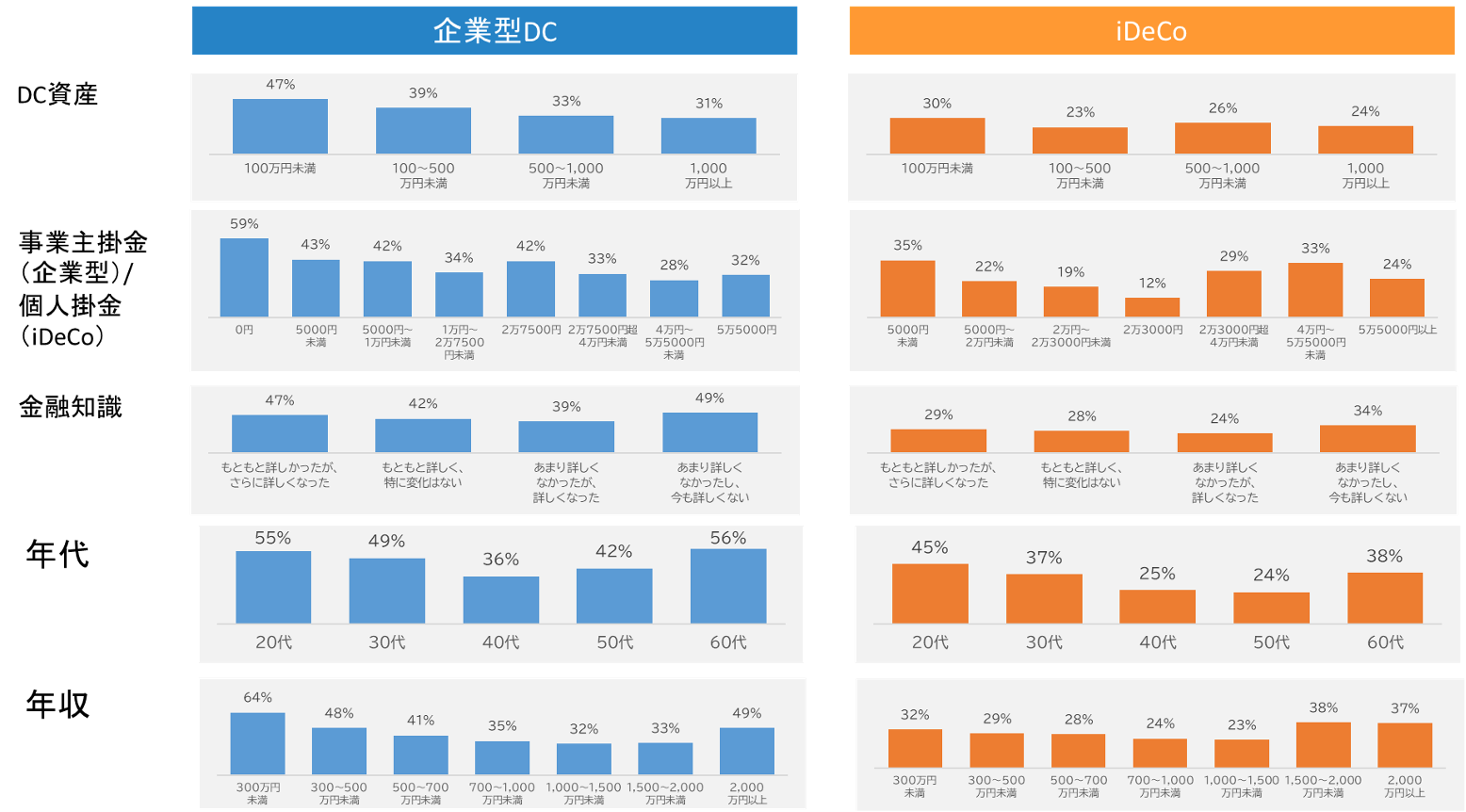 一方で、年代別では40〜50代が最も低い“U字カーブ”を描き、年収別でも同様の形になっています。これから老後資金を積み立てようと考える中堅層、積み立てをする余裕がある年収を得ている人ほど、DCの位置づけを理解していると解釈できます。