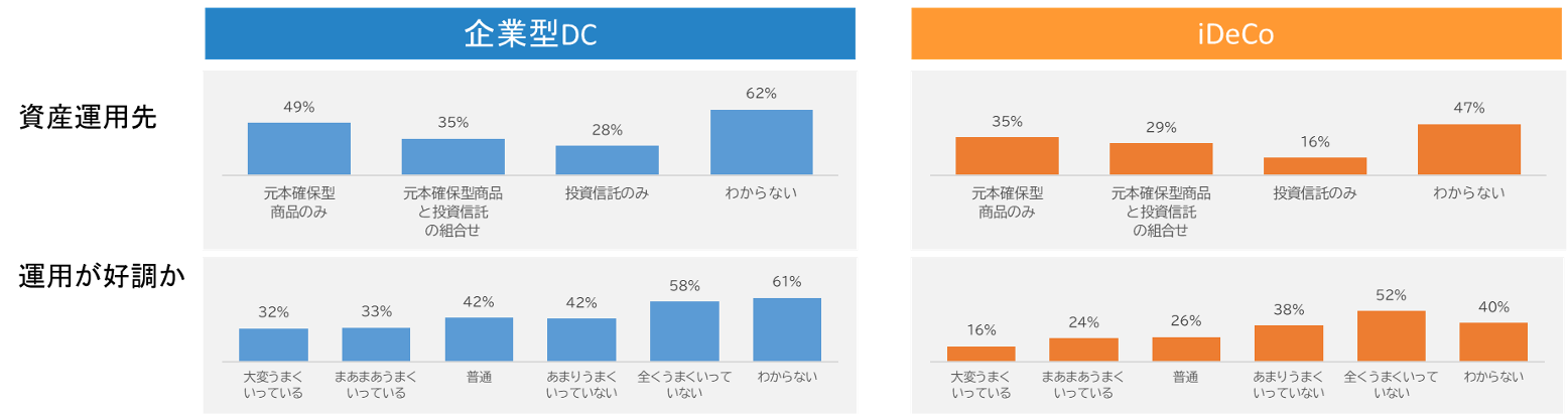 制度の知識が少なければ、運用についても関心がうすくなります。DCの運用先が「わからない」や「元本確保型商品のみで運用している」人、あるいは資産運用が「うまくいっていない」「好調か不調かわからない」と回答した集団では、DCを老後資金として選ばない確率が高くなっています(図表4)。