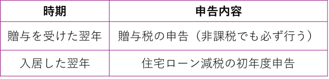 特に住宅ローン減税も利用する場合で、贈与を受けた年と、住み始める年がずれる場合は要注意です。以下のように確定申告が2年連続で必要になる可能性があります。