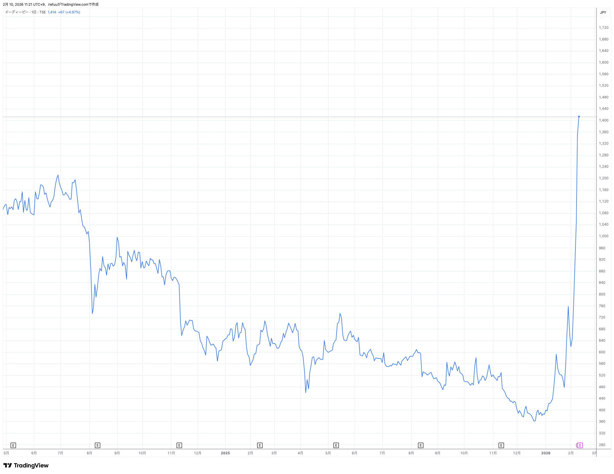 まずはこのチャートを見てください。ほぼ垂直にそり上がっています。2026年のはじめは400円台だった株価が、2月10日は1,600円とほぼ4倍。このチャートがどの企業のものであれ、投資家であれば何があったか知りたくなる形です。