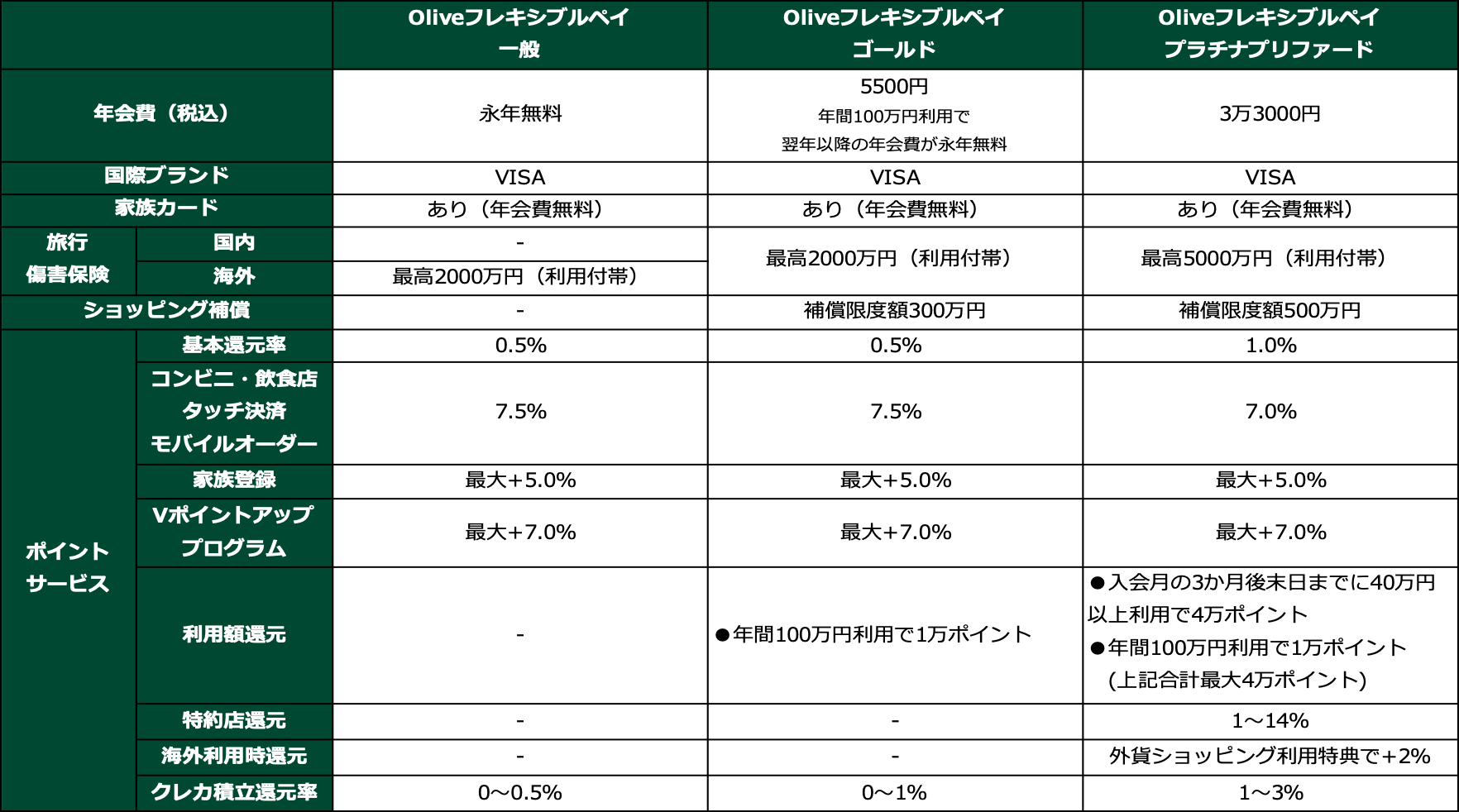 Oliveフレキシブルペイの3種類のクレジットカードの主な仕様