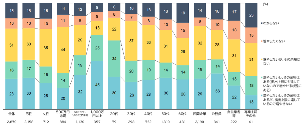 「掛金を増やしたいか」という問いに対し、「増やしたいし余裕はあるが、現在すでに限度額に達しているため、これ以上増やせない」と回答した人が全体の3割弱いました(図表4)。こうした人たちにとって、今回の限度額引き上げは待望の改正といえるでしょう。