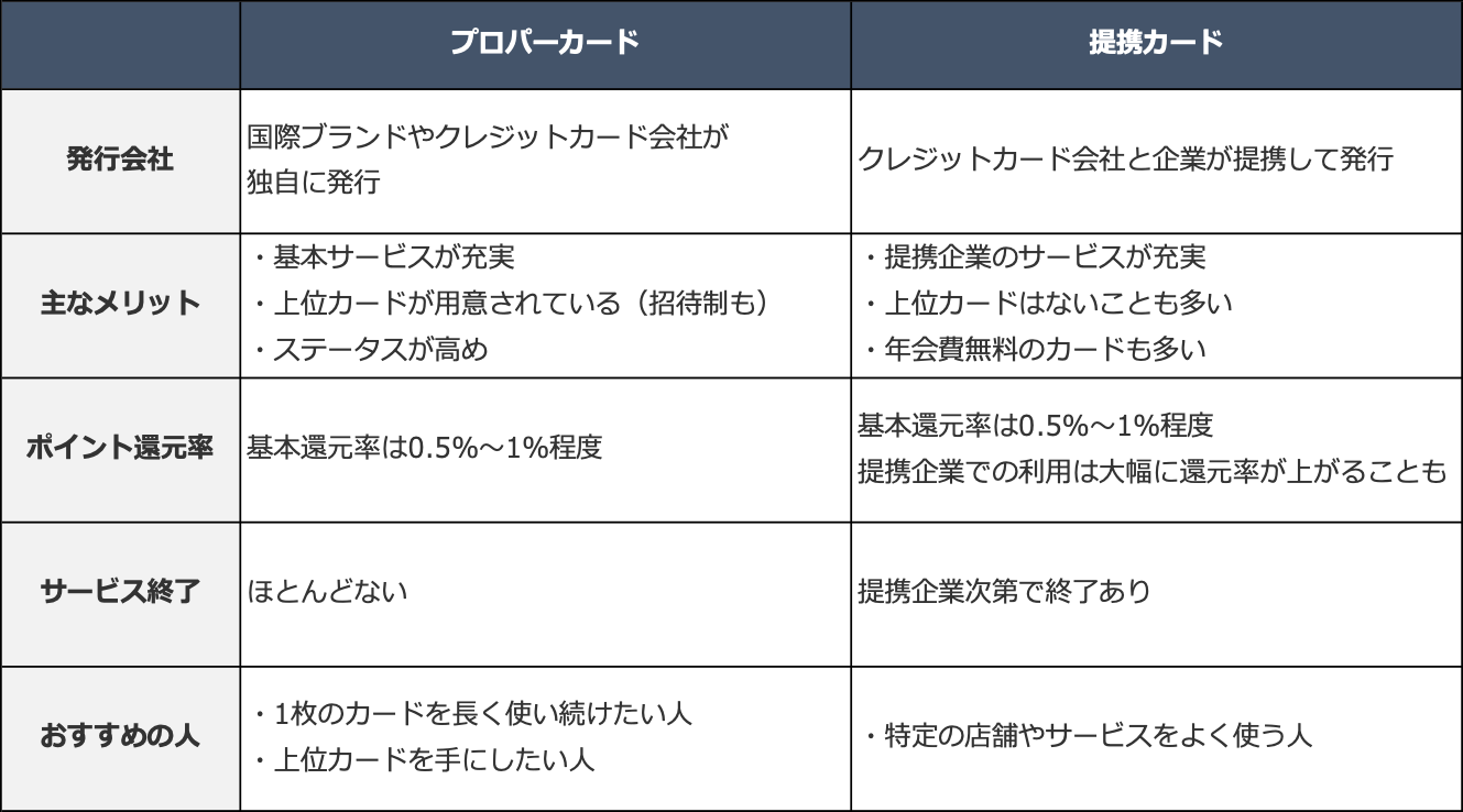 プロパーカードと提携カードの違いは次のとおりです。「すべてのカードに必ず当てはまる」というわけではないのですが、以下のように整理するとわかりやすいでしょう。