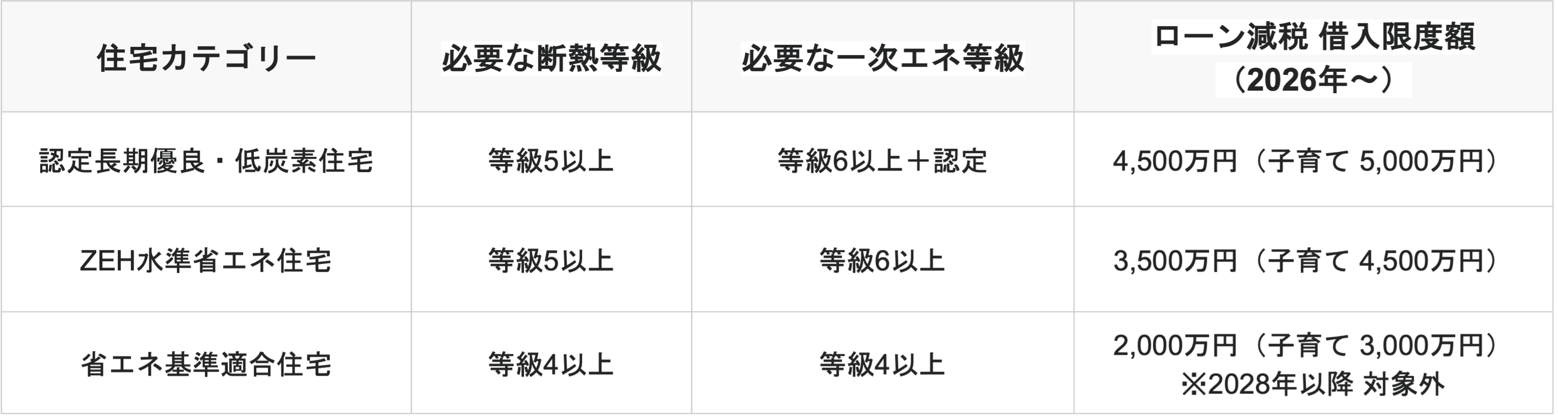 なお、省エネ基準適合住宅は2028年以降、2027年末までに建築確認を受けたもの等を除き、原則として住宅ローン減税の対象外となります。