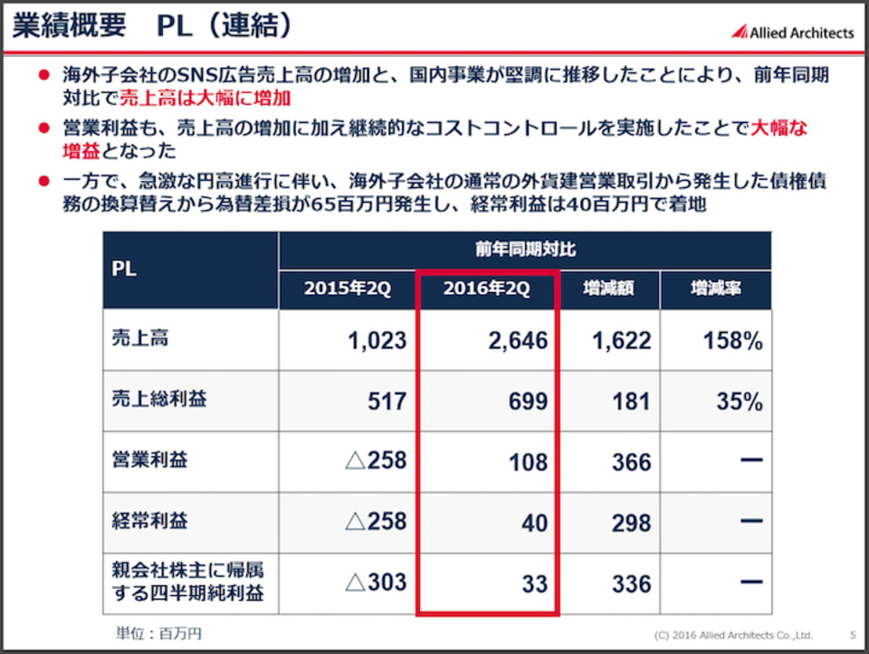 ※アライドアーキテクツ、平成28年12月期2Q決算補足説明資料より