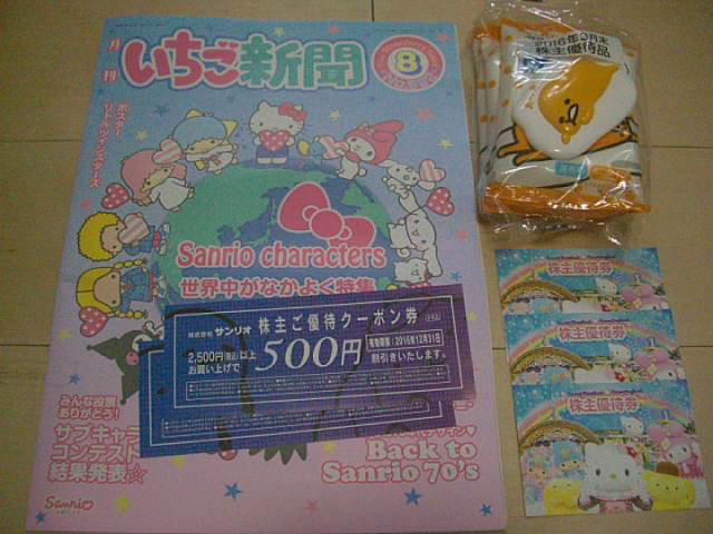 今年はサンリオピューロランドとハーモニーランドの共通優待券の他に買い物割引券、株主限定商品にはマイメロディ・ふた付きウェットティッシュと「いちご新聞」まで付いていました♪