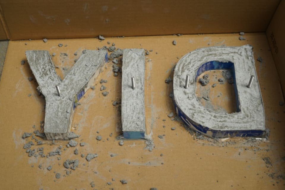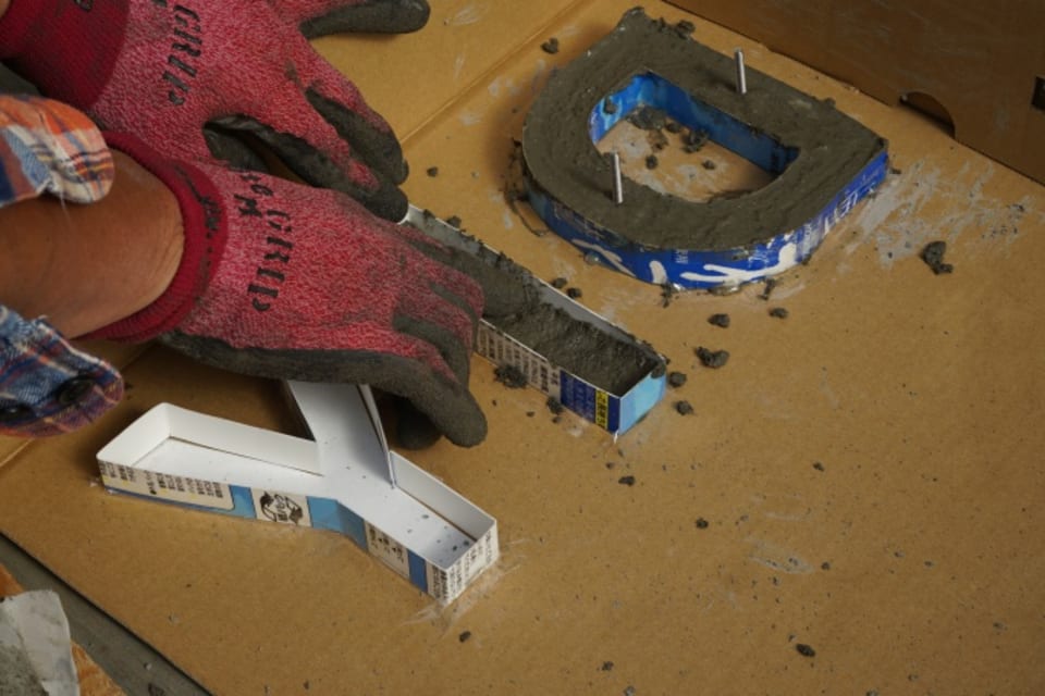 型にモルタルを詰めます。立体文字を壁面などに取り付けられるよう、ボルトを埋め込んでいます。