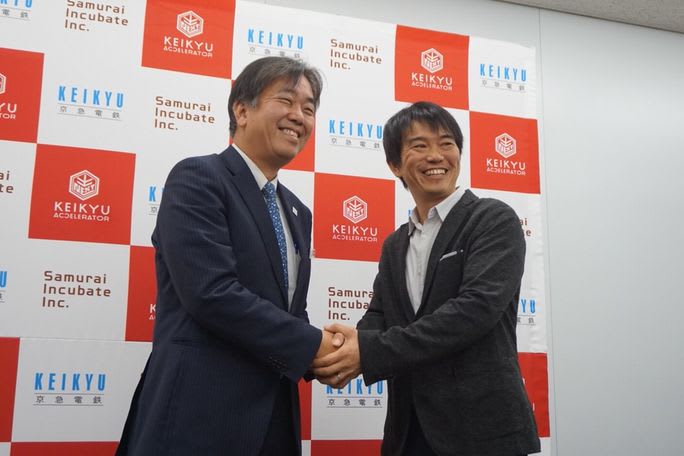 記者説明会で握手する、京急電鉄の沼田部長(左)とサムライインキュベートの榊原代表