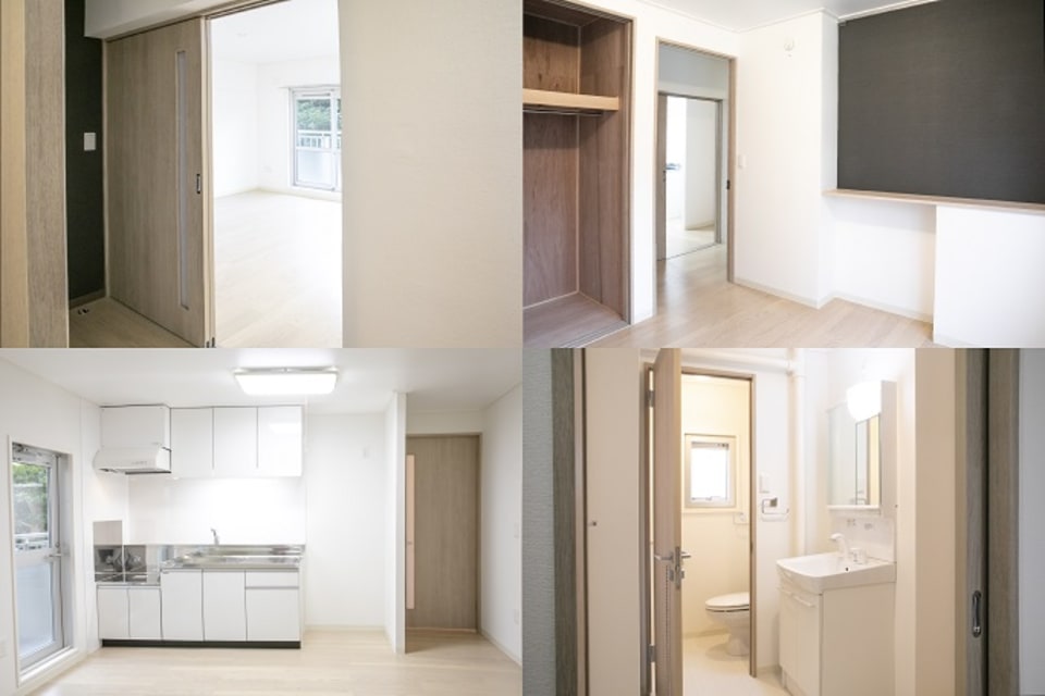 気になる室内はきれいにリノベーションされており、築年数を感じさせません。水回りはもちろん、間取りも現代のライフスタイルに合わせ、広々をした空間となっています。ドアや壁の木目色も近年人気の色合いにしており、床はフローリング張りです。(※一部畳の部屋もあります)