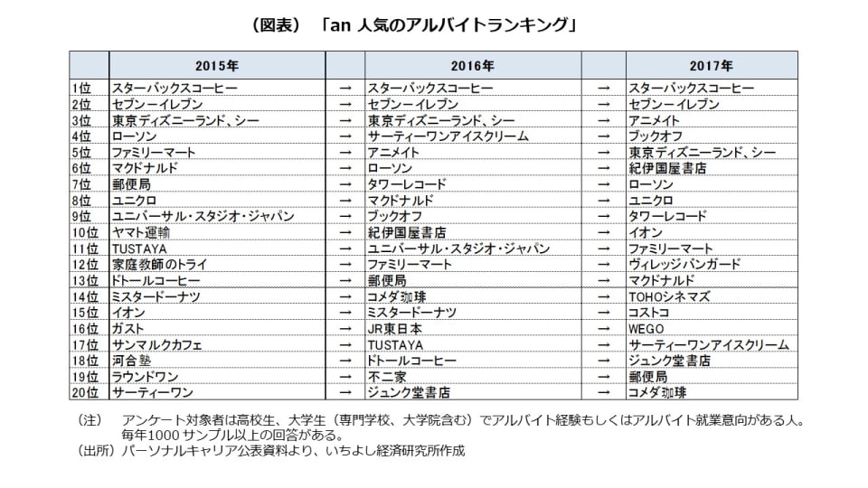 また、民間の人材派遣会社が毎年調査している「人気のアルバイトランキング」を見ると、「おしゃれな雰囲気」「利便性」「趣味系」「シフト重視」の4つに分類することができます。