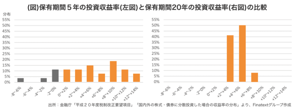図が示す通り、5年という中期的な運用では、一時的な経済要因や参入タイミングによって、プラス方向にもマイナス方向にも収益率にブレが生じますが、20年という長期的な目線で運用を行うと、そのようなノイズに左右されない安定的な資産形成が期待できるといえます。
