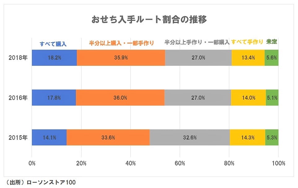 つまり、おせちは「作る時代」から「買う時代」へと変化したわけです。実際、ローソンストア100の調査によると、2015年には14.3%いた「すべて手作り」という回答が2018年には13.4%まで減少。逆に、「すべて購入」は14.1%から18.2%に増加。一部購入を含めると、全体の8割以上がおせちを買っていることがわかりました。