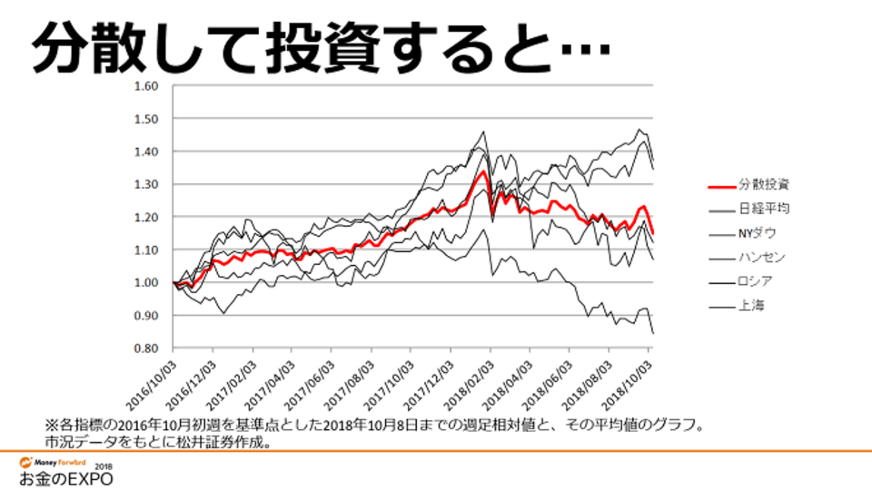 分散というのは、投資を1つに絞らずに複数のものに投資していきましょうという考え方です。こちらは日経平均株価のグラフになっています。2016年10月を基準点として1.0とし、その後どのぐらい上昇したか、下落したかを表している相対グラフです。