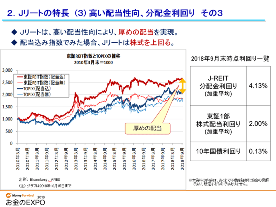 Jリートの分配金利回りは、今の平均で4%ぐらいです。高いところで6%ぐらい、低いところで3%ぐらいです。それに対して、東証一部の株の平均は2%ぐらいです。ただ、こういうものが一覧で見られるようなところには、Jリートの分配金利回りは出ていないのです。それも、知られていない要因の一つだと思っています。平均で見るとこういうことになります。もちろん、株でも高い利回りのものもあるのですが、平均ではJリートのほうがいいということが言えると思います。