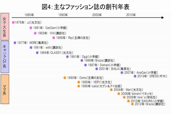 このような女性の変化を上手く捉えているのが、やはり女性ファッション誌業界です。主な女性ファッション誌の創刊年表を作って見ると、1980年代~1990年代前半は女性ファッション誌というと、女子大生向けのもの、若いOL向けのものしかありませんでした。