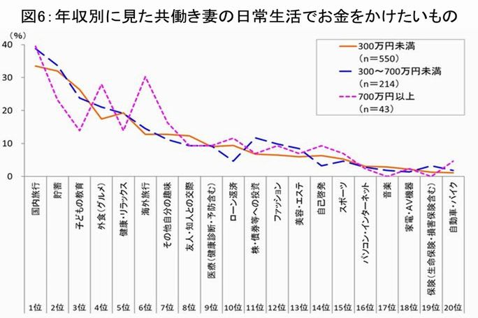 また、妻が年収1千万円以上では「たいへん余裕がある」割合が3割程度にもなります。そして、妻の年収別に見ても、パワーカップル妻は「外食」や「海外旅行」などの高額消費意欲が強い傾向があります(図6)。