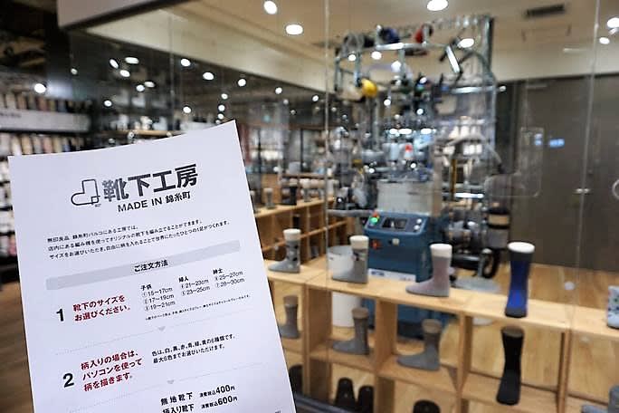 4階では、無印良品が1フロアを借り切り、都内最大級の店舗をオープン。窓に面した開放的な空間には、カフェと子供用の木育広場を設置しました。また、無印良品としては初めての試みとなる靴下編み機を導入。自分でデザインした靴下を作成することができます。