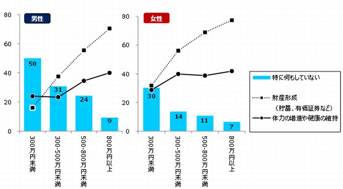 図2 正規雇用で働く中高年シングルが将来への備えとして「財産形成」「体力の増進や健康の維持」を行っている割合と「特に何もしていない」割合(性・年収別)<3つまでの複数回答>
