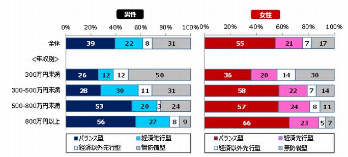 また、年収300万円未満の男性を除くと、男女とも「経済先行型」が2~3割程度を占めています。このなかには今後、経済面とともに、経済面以外の備えの重要性が高まる人もいるかもしれません。