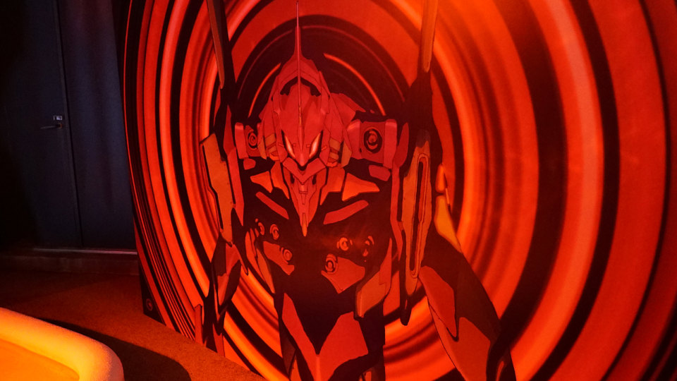 また、館内のさまざまな場所にエヴァンゲリオンをイメージした装飾が施されています。入り口の自動ドアが「A.T.フィールド」のようにオレンジ色にデザインされ、60段の階段いっぱいに「エヴァ初号機」が描かれていました。