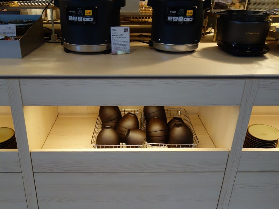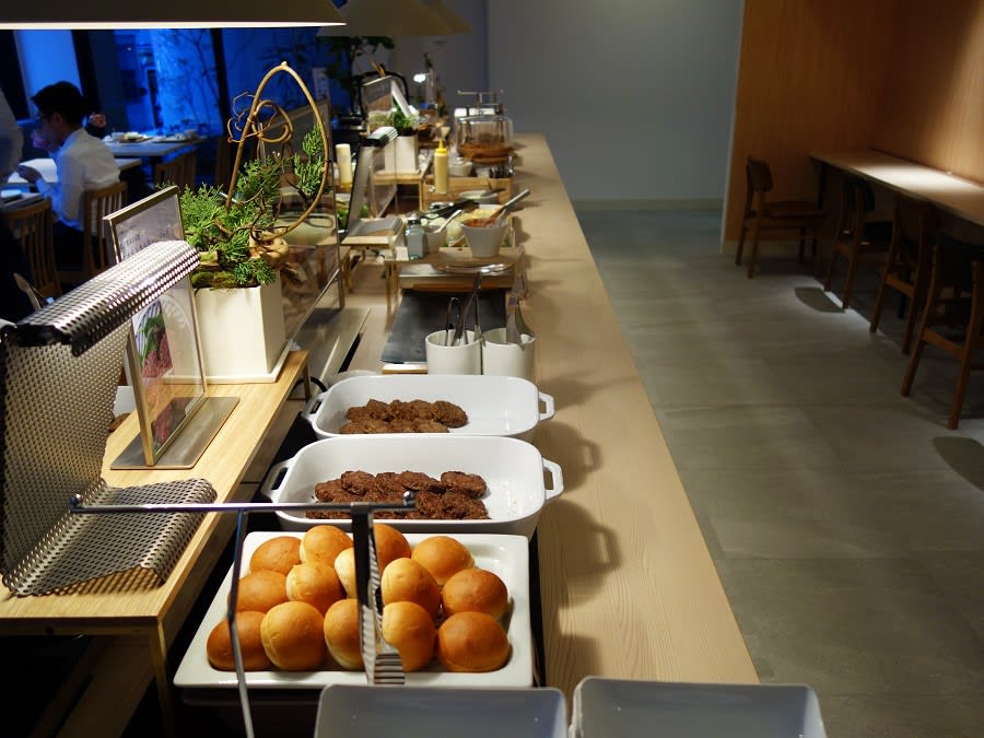 最も印象的だったのがブッフェボード。特に宿泊特化型のホテルでは、限定的な朝食会場スペースにしてブッフェボードのサイズも限られた寸法であることも多く、手に持ったトレイを一時的に置くようなスペースがないケースも散見します。こちらでは、開業にあたり相当な試行錯誤がなされ、ブッフェボード全体にわたりトレイを置くスペースが確保されています。