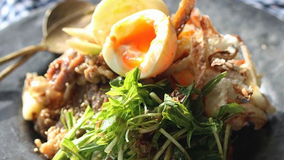 4. お皿に御飯を盛る。(真ん中を盛り上げるように、しゃもじで押さえつけると御飯のふわふわ感が損なわれるので注意する)上に揚げごぼう、水菜、肉を盛り付け、お好みで「生姜味噌漬けたまご」をのせて完成。