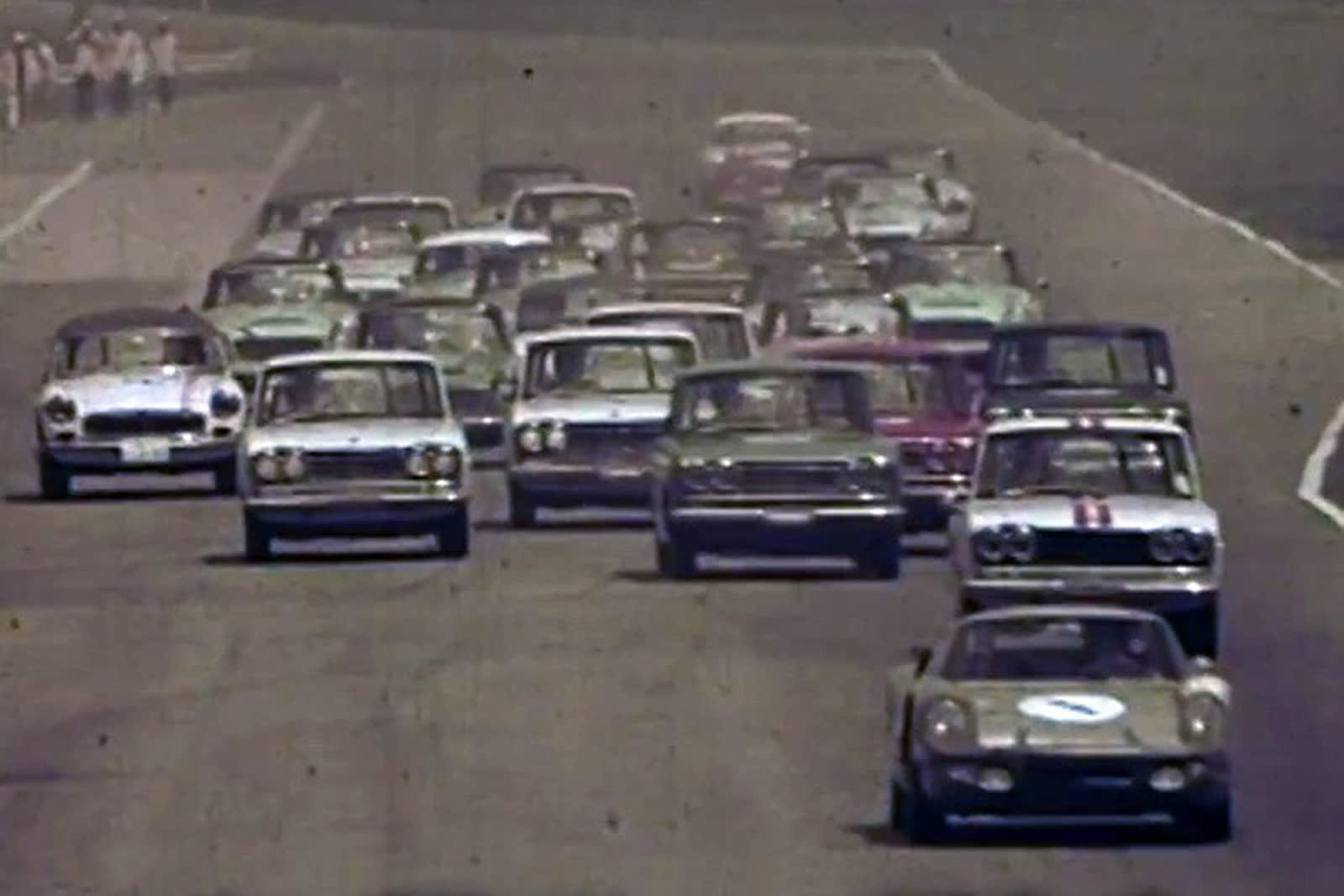 そして迎えた7周目。遅いクルマに手こずる式場さんを生沢さんが、その遅い車共々、2台をまとめてヘアピン手前で抜き去り、そのままトップに躍り出た状態でポルシェ904を従え、ホームストレートに現れました。当然、ポルシェには勝てないだろうと思っていたメインスタンドの観客は総立ちとなり、大歓声を送ります。3位を走っていた砂子さんはその様子をずっと後ろから見ていました。