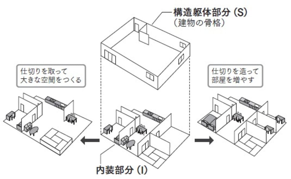 SI住宅とは構造躯体部分(S)と内装部分(I)が分離された構造を持つ住宅のことです。室内に構造壁がなく電気配線や給排水管の入れ替えもしやすくなっていて、家を、マッチ箱の内側だけを入れ替えるようにリノベーションできます。