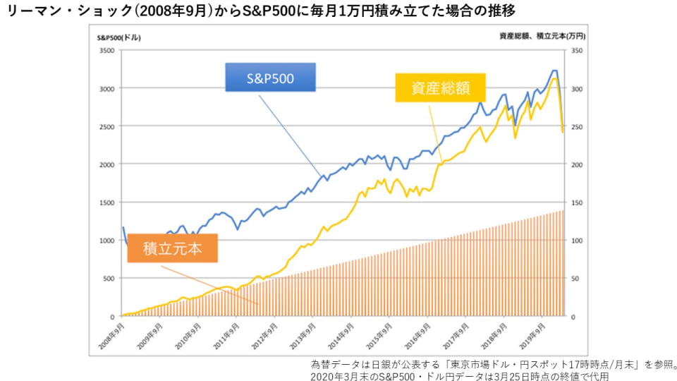 また、上図はリーマン・ショックが起こった2008年9月から、S&P500に毎月1万円積み立てた場合の推移を表します。本稿は3月26日に執筆していますので、2020年3月末のS&P500及びドル円の数値は、3月25日時点のもので代用しています。