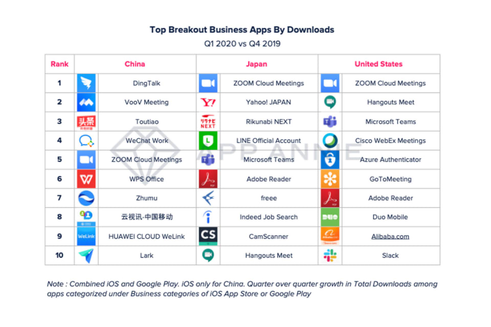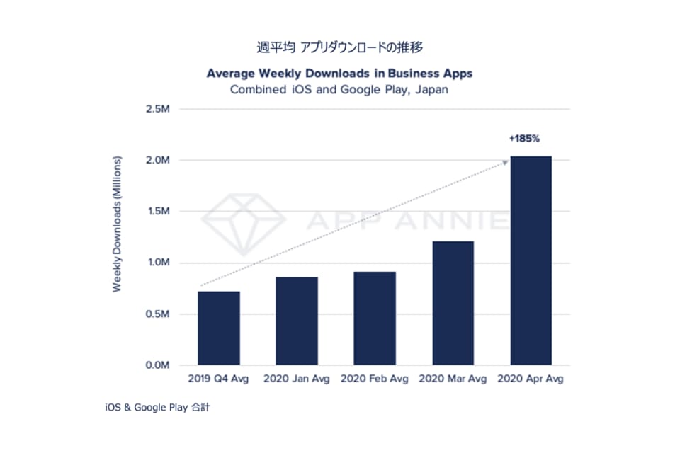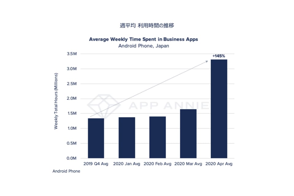 緊急事態宣言後、多くの企業がテレワークへ移行する中で、ビジネスアプリのダウンロード数、利用時間ともに急増しました。ビジネスアプリに代表されるようなビデオ会議ツールやチャットツールはPC で使えるものがほとんどですが、スマートフォンやタブレットにアプリをインストールするユーザーが多いようです。