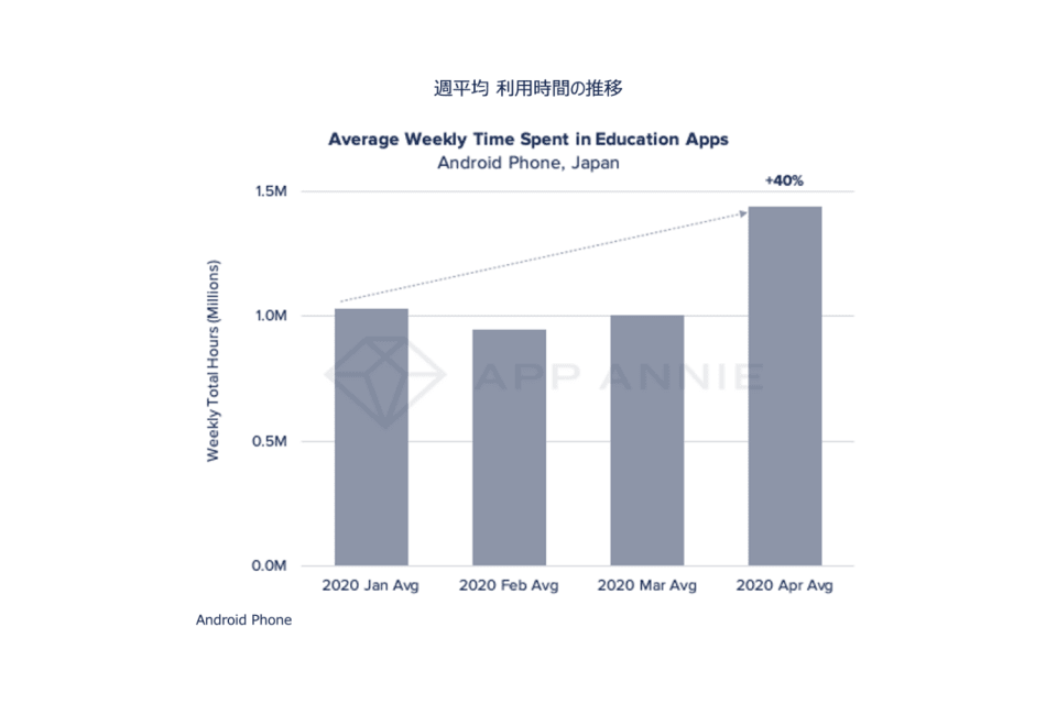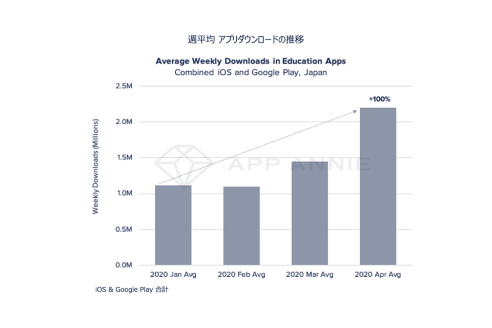 3月時点では、急激な成長は見られなかったものの、始業した4月から教育系アプリのダウンロード数、利用時間ともに急増しています。ビジネスと同じように、全体として教育のデジタル化も徐々に進みつつある傾向が見られます。