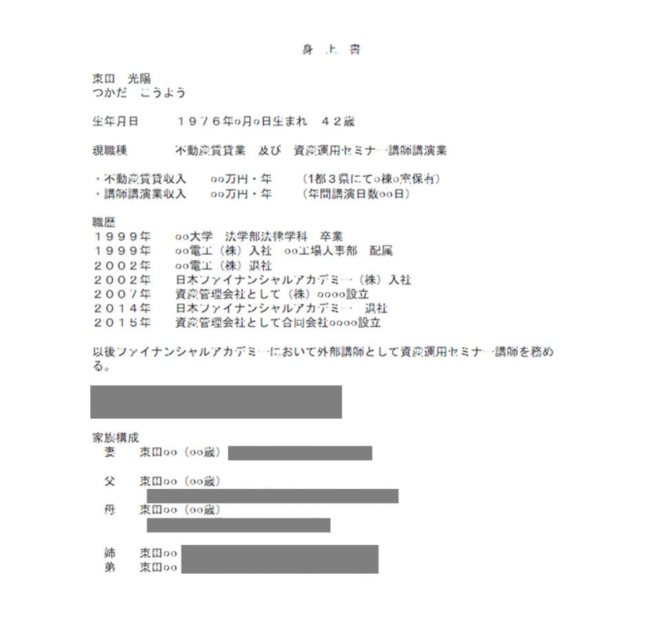 A4用紙1枚に自分のプロフィールをまとめて提示します。特に工夫するのは職歴ですね。私はメーカーの人事部で働いて、その後、当時ベンチャーだったファイナンシャルアカデミー(※マネースクール)に転職。今は独立し、外部講師としてアカデミーで教えています。ただ、この職歴をただ伝えてもダメ。ストーリーが大切なんですね。