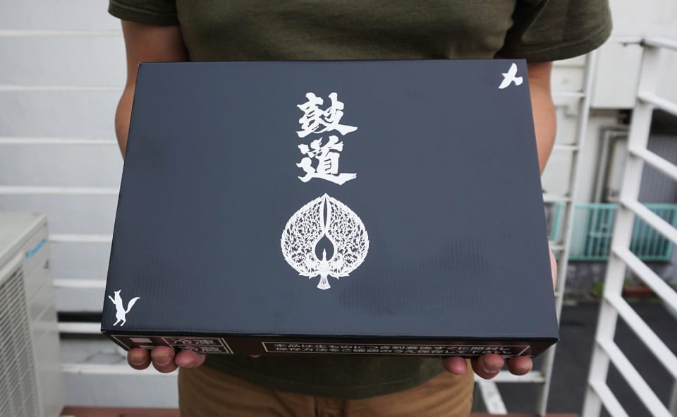 注文してから数日後、クール宅急便で届きました。冷え冷えの袋を開けると、中には高級感溢れる黒い箱に白い文字で「鼓道」の力強い印字。さっそく開けようとしましたが、どうやって開けるのかがわかりません。箱の表面を触っていたところ、この箱はカバーであり、横にスライドさせると、手前から開閉する箱本体が出てきました。こちらには、金箔による印字がされています。
