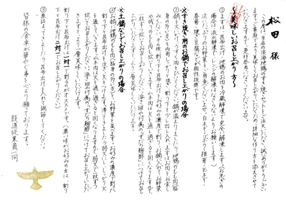 箱を開けると、冷凍されたミールキットがあり、その手前には手書きの「お召し上がり方」がありました。「鶏すき」というものを食べたことがなかったのですが、「鍋」と考えれば、作り方はおおよそ想像がつきます。しかし、高級食材を使ったミールキットを「絶対に美味しく食べていただきたい」というお店側の思いが、この手書きの「お召し上がり方」に現れ、自ずと「丁寧に作らなくてはいけない!」という気持ちにさせられます。