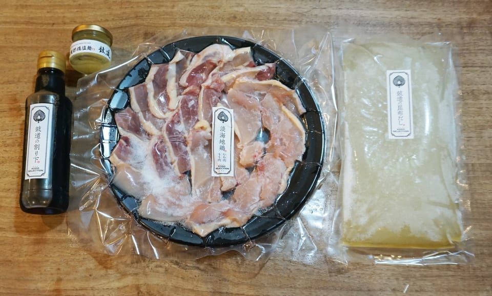 こちらが中身。「もも肉スライス(10枚=150g)」、「ムネ肉スライス(10枚=150g)」、「すき焼きタレ(200cc)」、「すだち麹酢(20g)」、「昆布だし(600cc)」という内容です