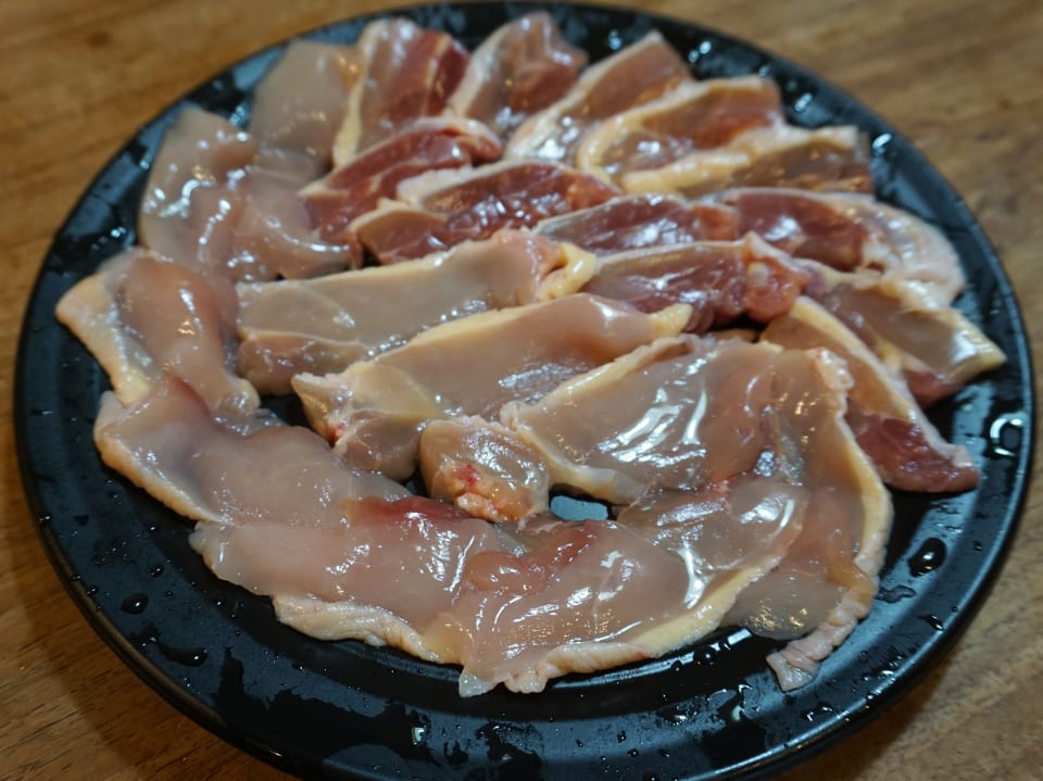 ↑手前がムネ肉、奥がモモ肉。いずれも一般的な鶏肉とは違う色、艶があります