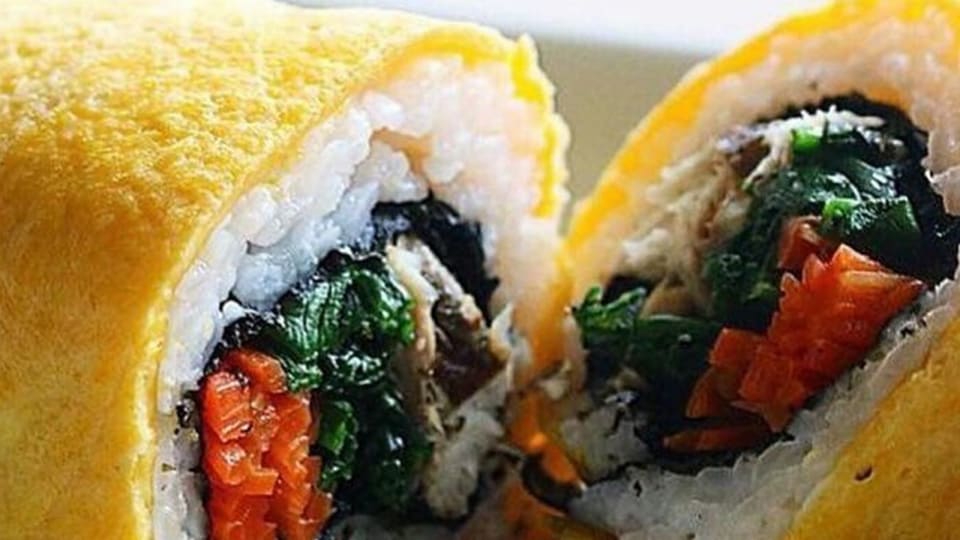 にんにく醤油で照り焼きにしたサバの身をほぐして、ナムルと一緒に巻きます。海苔だけでなく卵でも巻いてみましょう。彩りが一気に華やかになります。