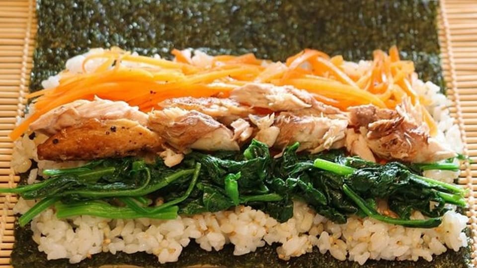 ほうれん草を使って、韓国風海苔巻き「キンパ」を作りました。酢飯ではなく、胡麻油で風味付けしたご飯で作る海苔巻き、中にはほうれん草と人参のナムルを挟みます。牛焼肉を一緒に挟むのが一般的ですが、牛肉の代わりに“サバ”を使いました。