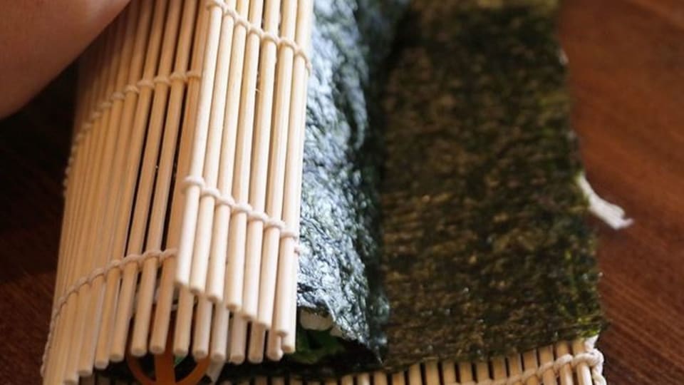 手前と奥のご飯を合わせるように一気に巻いていく。