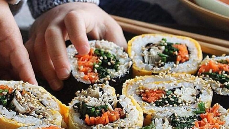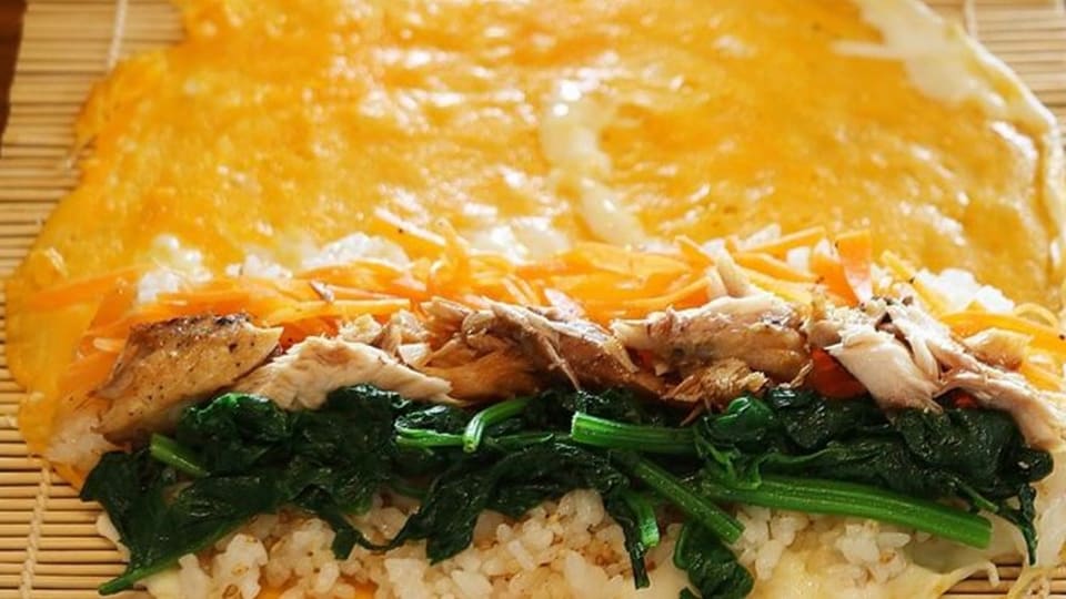 にんにく醤油で照り焼きにしたサバの身をほぐして、ナムルと一緒に巻きます。海苔だけでなく卵でも巻いてみましょう。彩りが一気に華やかになります。