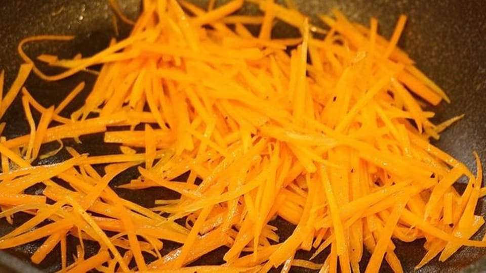 人参は千切りにする。フライパンに胡麻油大さじ1を敷き炒める。しんなりしてきたら塩をふって味を整える。