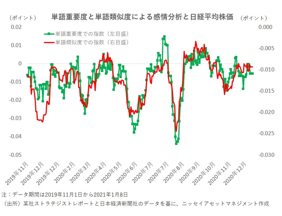 一方、足元はどうでしょうか。変動はみられますが、2020年の終盤と同じ高い水準を維持しており、“前向き“な感情分析の結果であることが分かります。