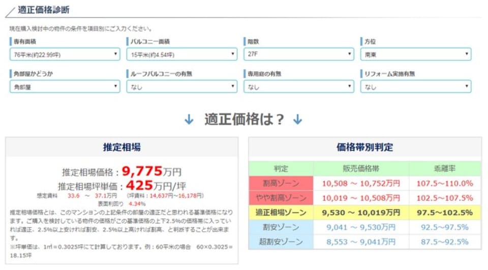 「適正価格診断」の一例。「専有面積」「バルコニー面積」「階数」「方位」など条件に合わせて、推定相場と価格帯別判定がすぐに表示される