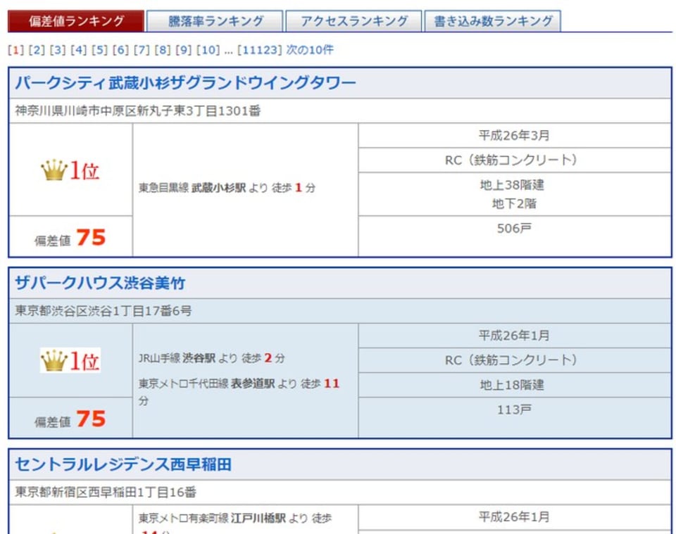 分譲マンションランキング。ここでは全国の偏差値1位の物件を表示した。ほかに騰落率、アクセス、書き込み数のランキングを用意