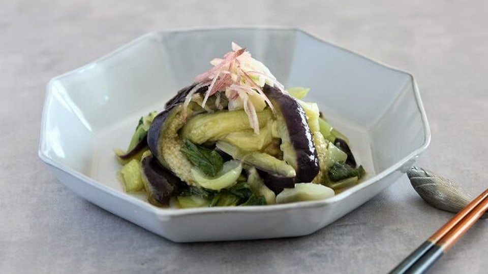 茄子がとろとろ食感なので、歯触りの良い葉物野菜と好相性です。
