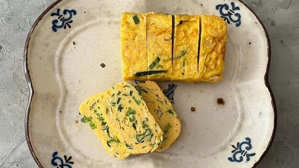 3. ボウルに卵3個を割り入れて溶きほぐし、2と青ネギを加えてムラなく混ぜ、巻きながら焼いて玉子焼きにする。切り分けて器に盛りつける。